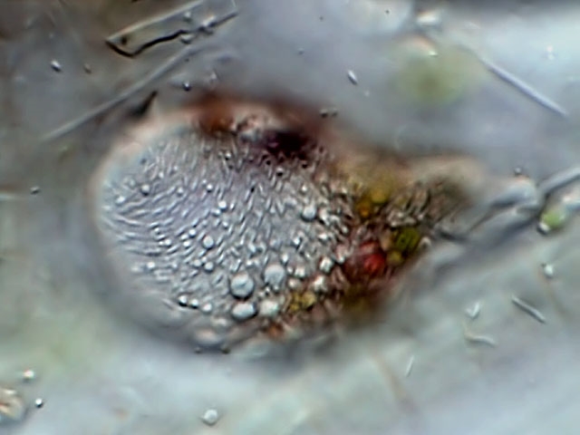 Dieser Text im "Wassertropfen" ist m.E. etwas irreführend.  Diese Strukturen sind in der Tat nur mit Silberimprägnierung darstellbar. Ich habe zufällig heute in einer probe P. trichophorum gefunden und habe versucht, die Pellikula mal zu fotografieren. Zwar sind die Fotos nicht besonders spektakulär, doch zeigen sie spindelförmige Körperchen in spiraliger Anordnung, die  Trichozysten   ("trichophor"). Die kreisrunden Gebilde sind wohl Reservestoffe :