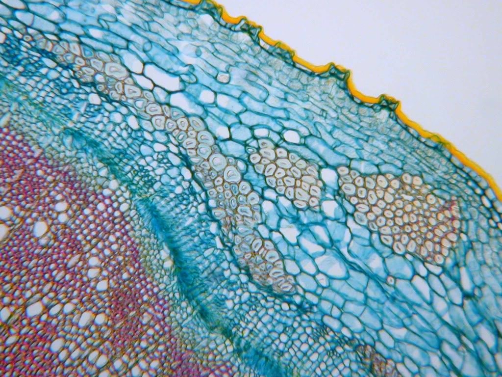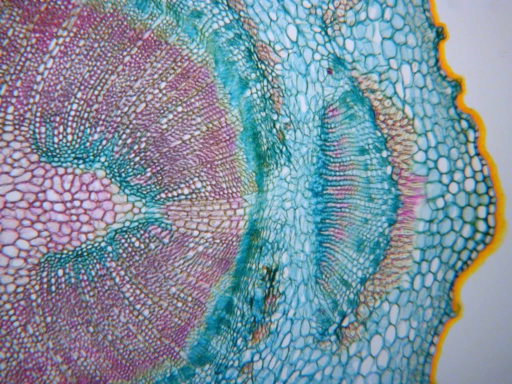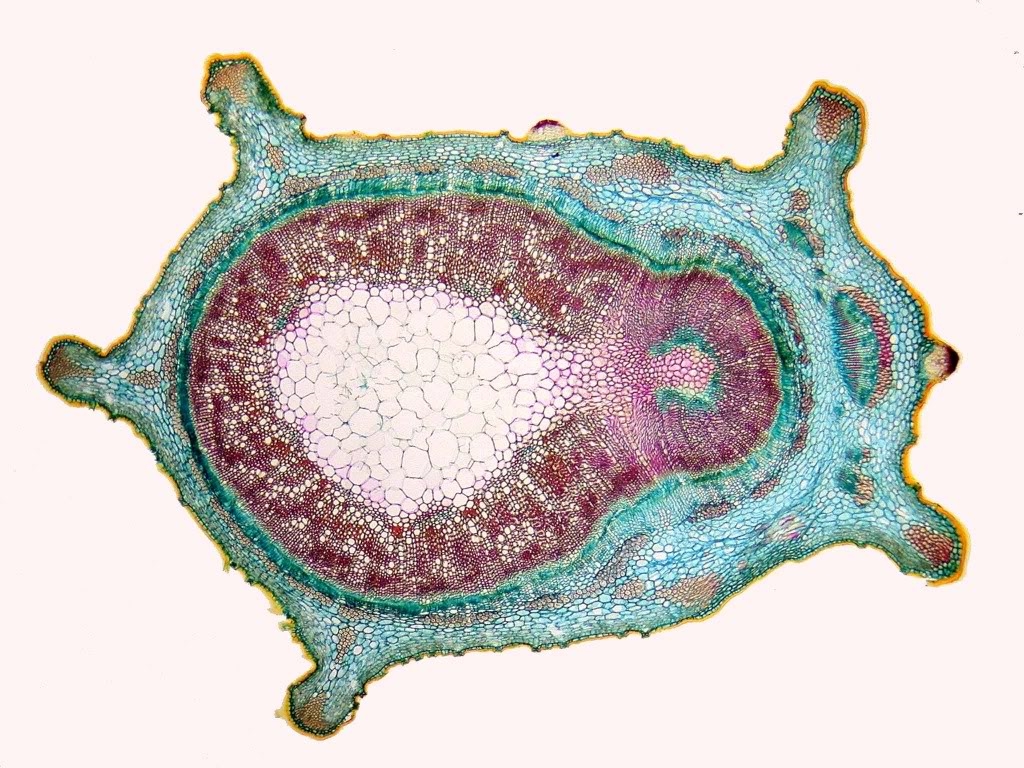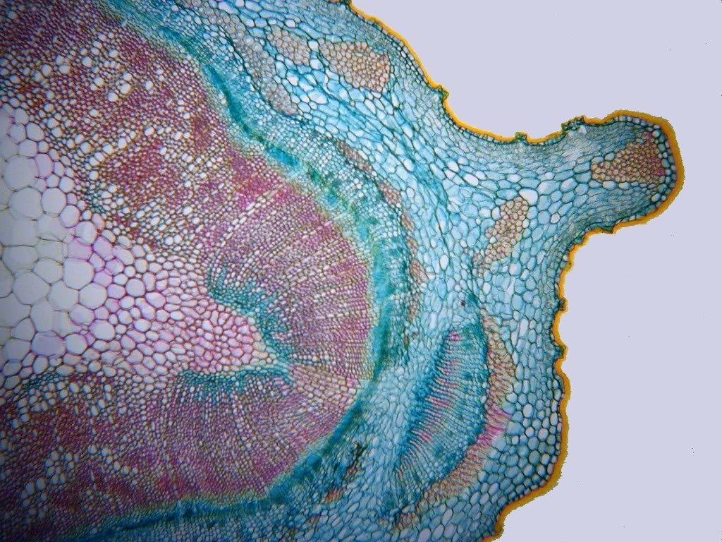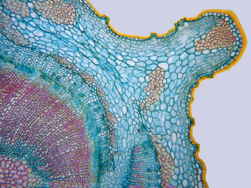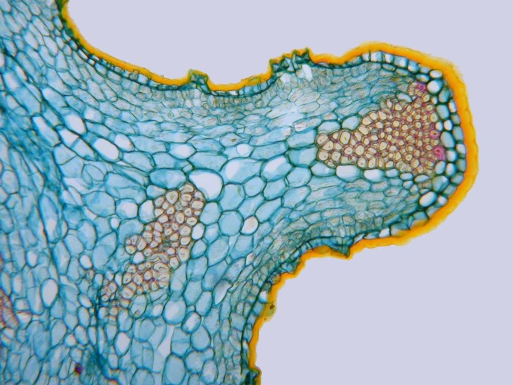 Zellwände blaugrün bis grün, verholzte Zellwände leuchtend rot. Zellwände der äußeren Hypodermis orangerot, Cuticula gelb