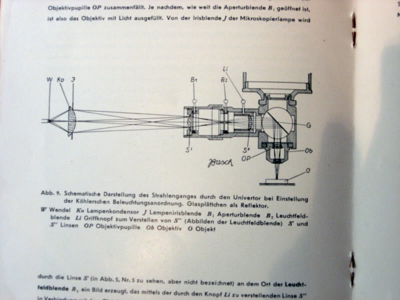 hier folgt meine "einfache" Blitzlösung" für das Amplival, für die ich den Univertor des Metaphots von Busch Rathenow zweckentfremde. Das Gerät wurde wohl 1939 erstmals produziert. Es dient eigentlich dazu, die Auflichtbeleuchtung im Hell- und Dunkelfeld am Metaphot sicherzustellen und spiegelt das Licht von der Seite in den Strahlengang des Auflichtmikroskops (s.Skizze).