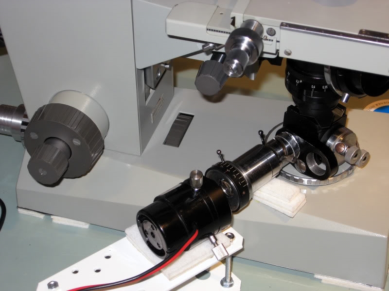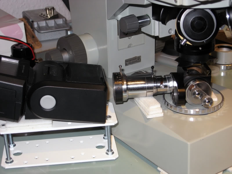 In der Art mache ich es auch, da es mir dann doch zwischen Kondensor und dem Fuß ziemlich eng wird, wenn noch gewisses Zubehör in den Strahlengang muß.