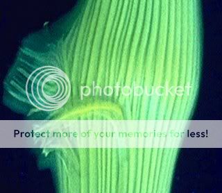 Hier mal eine Aufnahme eines mit Xylol durchsichtig gemachten Knotens eines Rebtriebs mit Fluoreszenzfärbung des Xylems. Die gebogenen Stränge unten gingen ins Blatt, das im Herbst abgefallen ist; das Büschel führt in das Winterauge, das dann im Frühjahr austreiben würde.