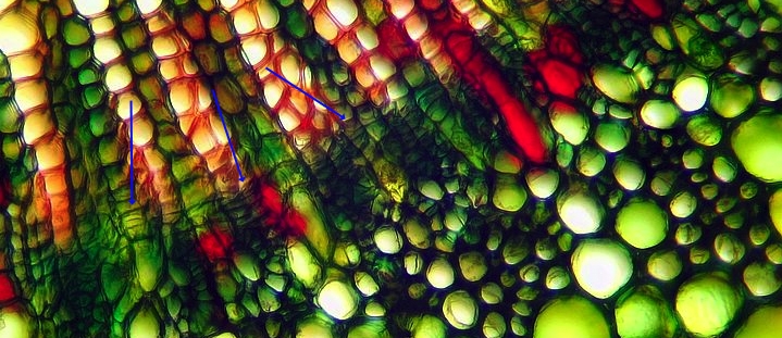 Was ist denn dann das Gewebe, welches ich mit den blauen Pfeilen markiert habe? Nun, ich werde jetzt nicht behaupten wollen, dass dies tatsächlich ein funktionierendes Kambium sei, nachdem ich jahrelang gepredigt habe, dass es in Blättern kein sekundäres Dickenwachstum gibt. Aber, man muss vorsichtig sein. Aussehen tut es jedenfalls wie Kambium und das ist nichts ungewöhnliches. Es wächst aber bestimmt nicht - oder? Laut Lehrbüchern jedenfalls nicht.