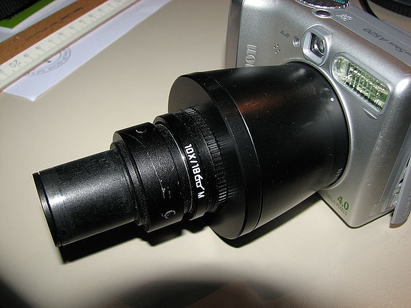 eigentlich nutze ich eine sehr einfache Kameraadaption: eine Canon Powershot A520 (die den Vorteil hat, per Programm komplett am PC fernsteuerbar zu sein) mit den  zugehörigen Filteradapter von Canon, einem Zwischenring von Klaus (52 mm Aussengewinde auf 28 mm Innengewinde) und einem Leica Periplan Okular mit angedrehtem 28 mm Gewinde.