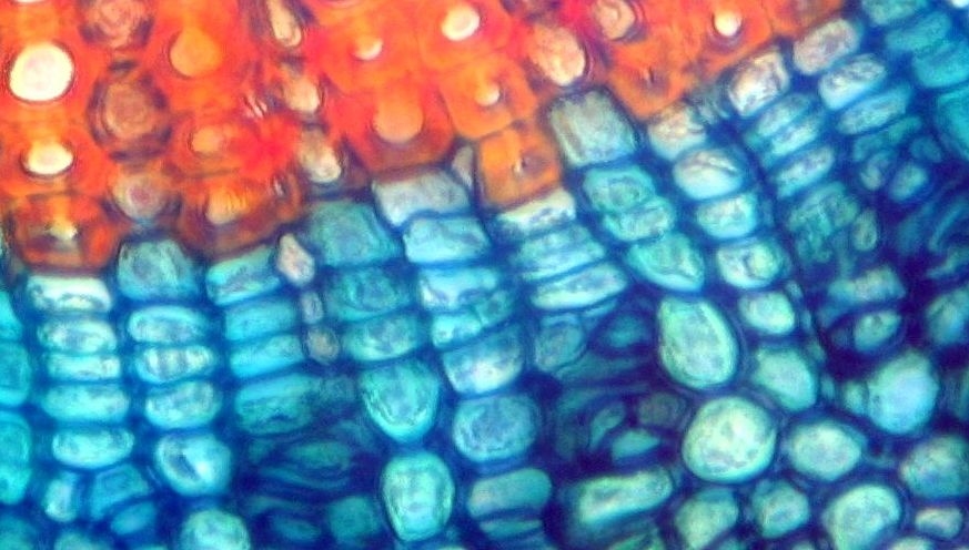 Wie hier beim Buchsbaum: in der Mitte das Cambium, beidseitig flankiert von den "Backsteinzellen, dann oben das Xylem und unten das Phloem sich anschließend.