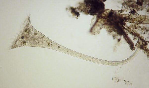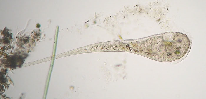 das folgende, kontraktile Trompetentier finde ich in meinen Proben aus dem Verlandungsgebiet des Pillersees immer wieder. Es ist bis zu 1 mm lang. Ein Gehäuse konnte ich nie entdecken.