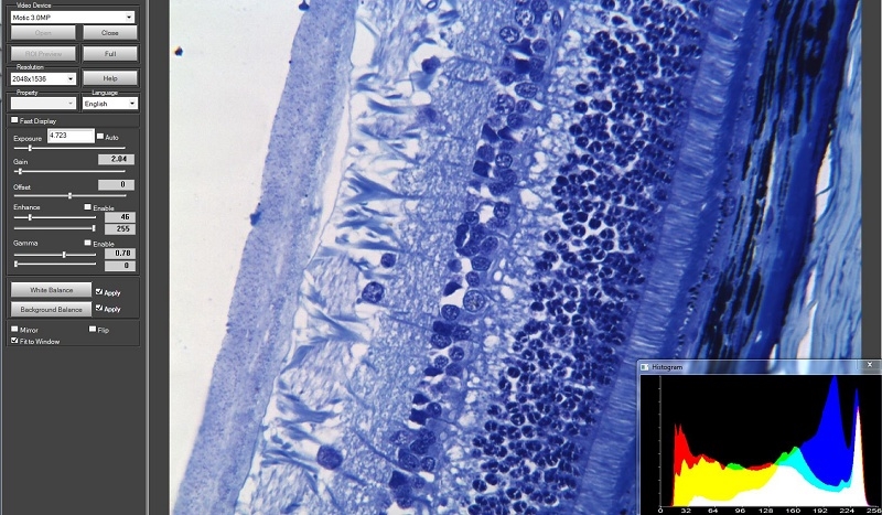 ich hatte dasselbe Problem mit der Moticam2500 bzw. "Motic Images". Die Steuerung der Trackbars für die Einstellungen über die Maus scheint ziemlich grob zu sein (vielleicht ist auch meine Maus oder Grobmotorik schuld). Dann scheint es so, als ob das Bild ganz plötzlich schlechter wird. Man kann sie feiner vornehmen, wenn man stattdessen die Pfeil-Tasten benutzt. Zwischen den Änderungen/Einzelschritten sollte man immer einen Augenblick warten bis sich das Bild verändert und stabilisiert hat. Das dauert besonders bei hoher Auflösung manchmal etwas.