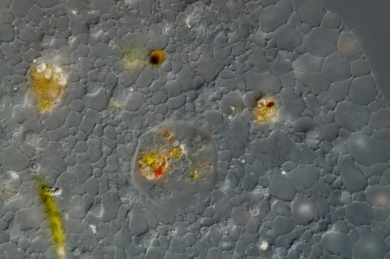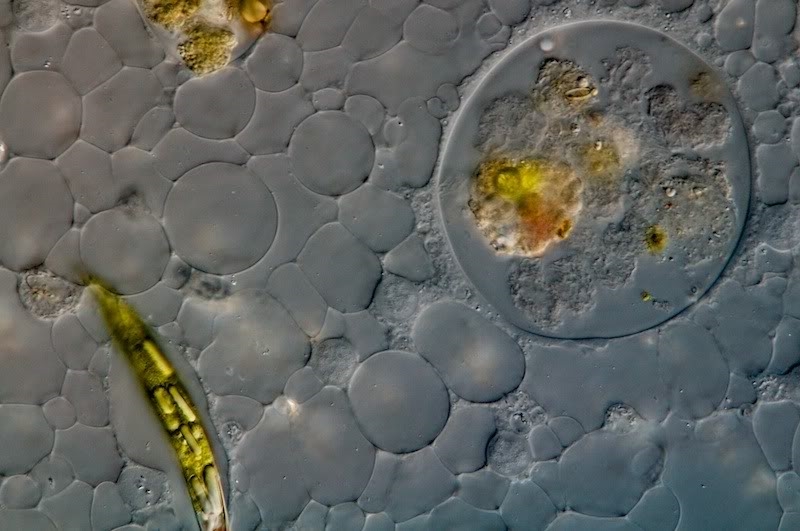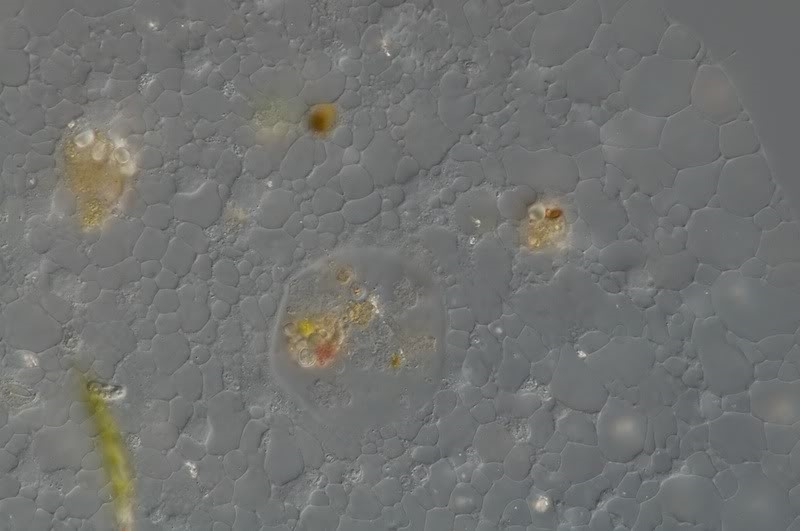heute hab ich mal wieder ein grosses Sonnentierchen in meiner Probe gefunden. Die Axiopodien wurden eingezogen, das kugelige Raubtier mag den Aufenthalt unter dem Deckglas nicht so gerne.