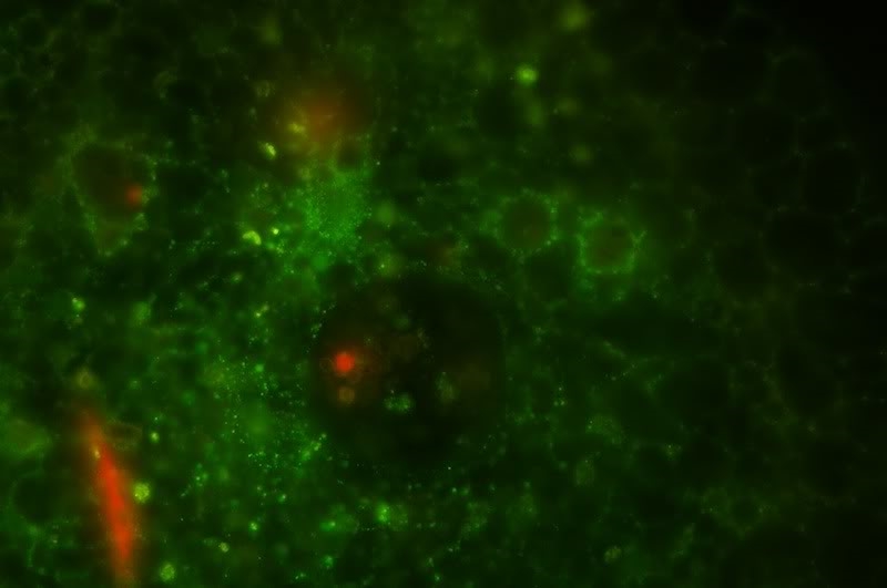 Ich wollte eigentlich die Kerne sehen, deswegen habe ich etwas verdünntes Acridinorange durch die Probe gezogen. Aber da muss ich wohl noch etwas mit der Dosierung experimentieren, jedenfalls waren die Kerne so nicht zu sehen. Dafür sieht man die Chlorophyll Autofluoreszenz in den Nahrungsvakuolen mit frischer Beute.
