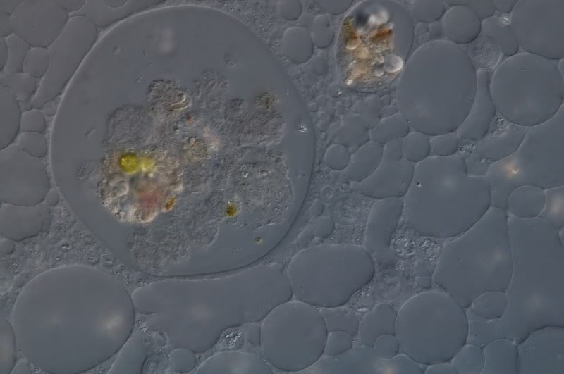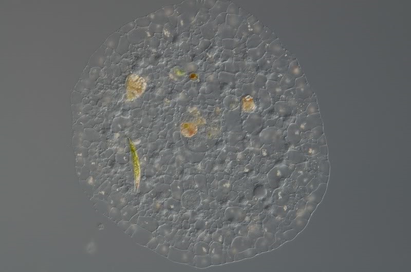 In der Übersicht erkennt man schön die Nahrungsvakuolen und die äussere Rindenschicht. Die Euglena Alge ist übrigens nicht in einer Nahrunsvakuole sondern liegt oben drauf!