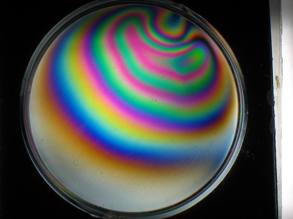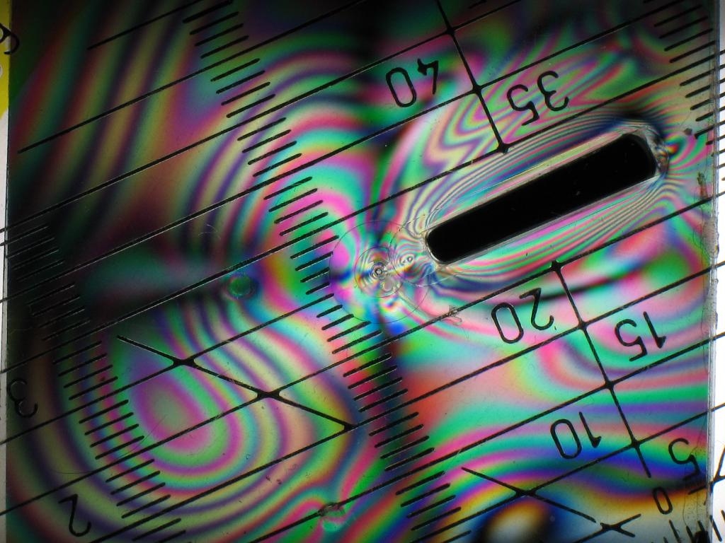 Wir haben seinerzeit flächige Substrate, z.B. Objektträger, mit doppelbrechenden Flüssigkristellen beschichtet und die Fehlstellen mittels polarisationsoptischer Methoden untersucht. Dies diente der Qualitätskontrolle von Materiealien für die LCD-Industrie, dort waren die Substrate natürlich grösser - Je nach Fehlerursache waren die Fehlerbilder analog den "Geodreieckbildern", jedoch auf mikroskopischer Ebene.