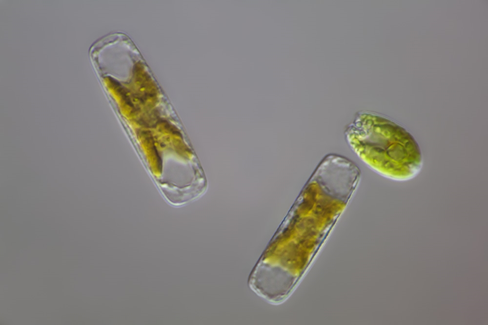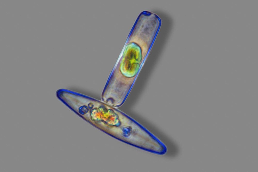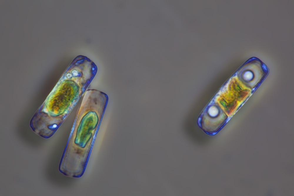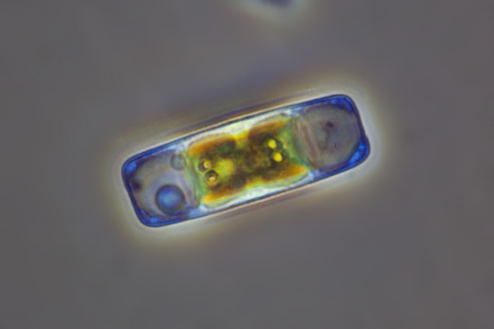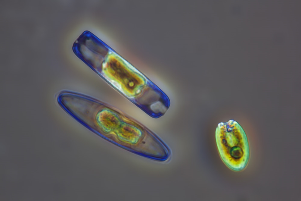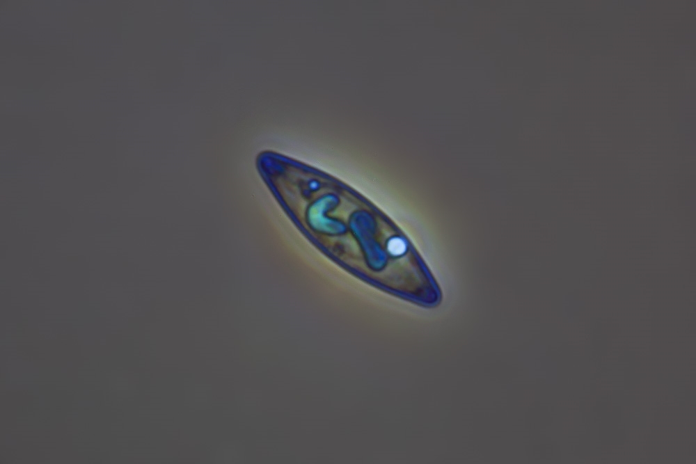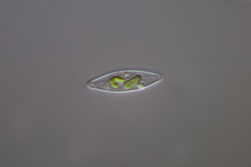und konnte jetzt die ersten Aufnahmen von (sehr kleinen!) Kieselalgen aus einer Wasserprobe machen.