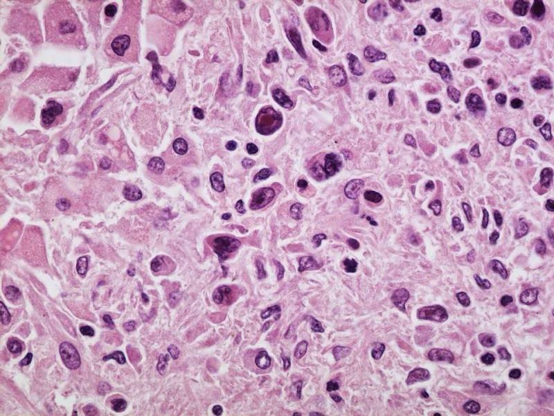 Hier mal ein Beispiel: Krebszellen in der Leber bei einem malignen Lymphom (Morbus Hodgkin) nach Chemotherapie - es sind hier viele Zellen abgestorben, allerdings sind auch etliche besonders "fiese" Zellen übrig geblieben: In den Kernen siehst Du eine unregelmäßige blaue Färbung durch das Hämatoxylin, die darauf hinweist, dass die DNA hier zu einem großen Teil abgespult ist (daher helle Areale) und abgelesen wird. Andere Zellen weisen sehr große Kerne mit gut erkennbaren Nukleolen auf, was auf reichlich DNA einer aneuploiden Zelle hinweisen kann. Wiederum andere Zellen haben ein sehr dunkles, dichtes, unregelmäßiges Kernchromatin; diese Zellen sind offenbar dabei, aufgrund der Chemotherapie abzusterben.