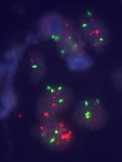 Sog. FISH-Test zum Nachweis einer Amplifikation des HER2-Gens (rot, Zentromer Chromosom 17 (CEP17) grün). Man erkennt im DAPI blau die DNA.