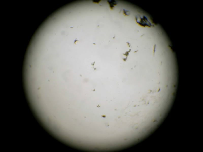 Ich versichere, dass der Schmutz, den man auf den Fotos sieht, auf dem Obektträger befindet oder auf anderen Mikroskopteilen sein Dasein fristet, aber nicht durch das Objektiv bedingt ist. Von den doch heftigen Fehlern des Objektivs bemerkt man eigentlich nichts.