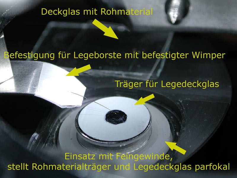 umgebauten Kondensorträger. Dieser trägt die Legeborste. Als Legeborsten nehme ich meine eigenen Augenwimpern....