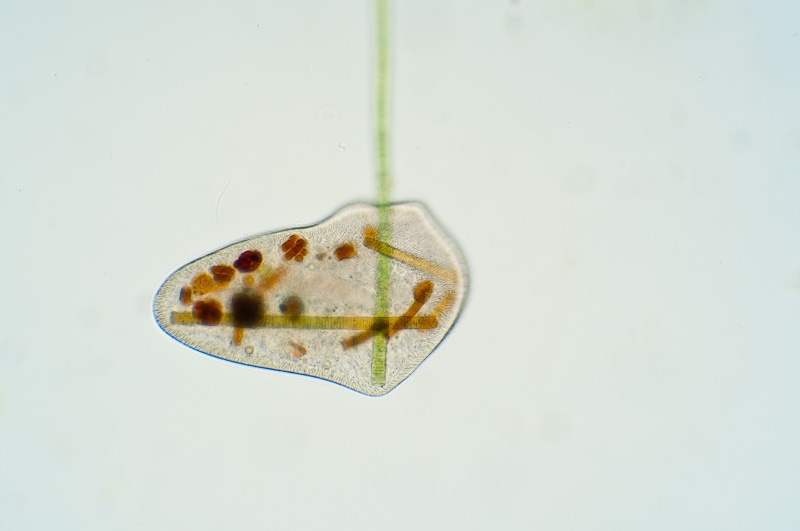 Das sind sehr schöne Hellfeldbilder, sie zeigen vermutlich Nassulopsis elegans. Man erkennt zwar die Reuse nicht eindeutig, aber Form, gefärbte Vakuolen und besonders dieses Einschlürfen von Cyanobakterien sind sehr typisch. Mehr dazu in dem schönen Buch von Martin Kreutz, das ich jedem Tümpler sehr ans Herz legen möchte!