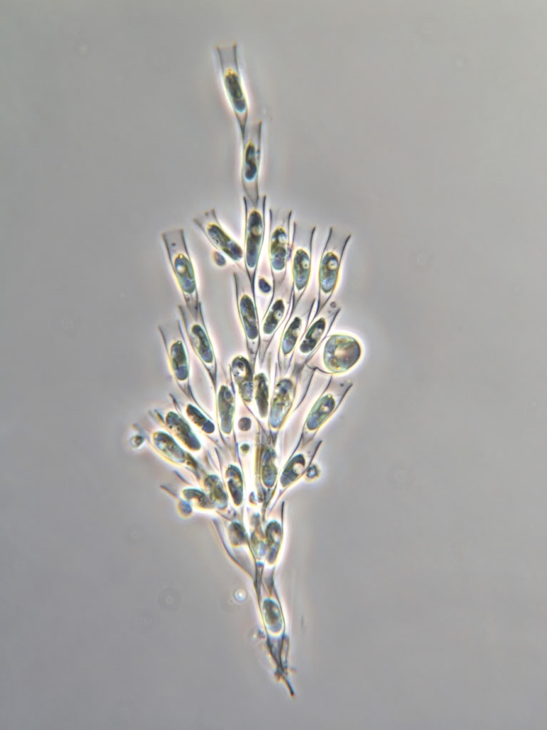 Um die Zuchthydra zu füttern, fischte ich Plankton in unserem Schulteich. Mit dabei fanden sich viele Dinobryon (Art?)