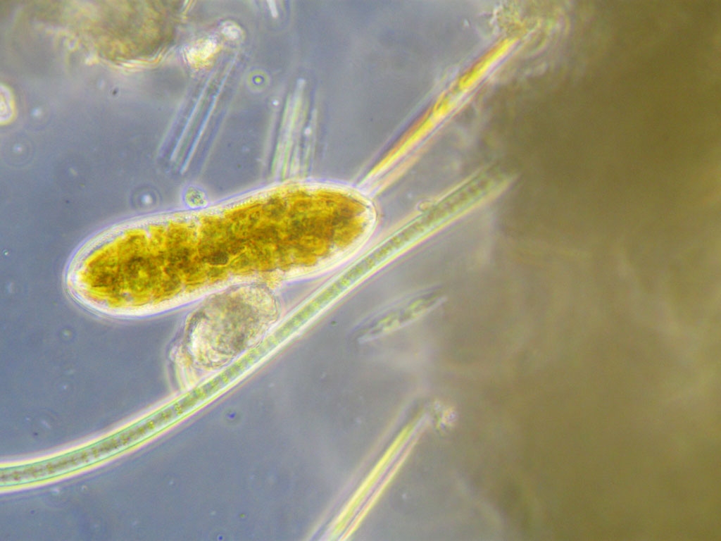 Die Aufnahme ist im Phasenkontrast erstellt, vermute ich. Hier kommt man manchmal zu klareren Bildern, wenn die Apperturblende nicht so weit geschlossen wird, wie´s bei Hellfeld üblich ist. Dann lösen sich auch die Farbsäume weitgehend in Wohlgefallen auf, die Halos werden weniger ausgeprägt und die Identifizierung wird leichter.
