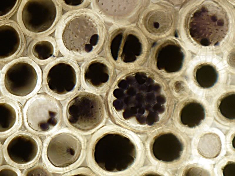 hier mal zur Abwechslung ein pflanzlicher Frühlingsbote: ein Querschnitt durch einen Stengel (ca. 5 - 7 mm Durchmesser) einer Waldrebe (Clematis vitalba). Ungefärbtes Frischmaterial, gefärbt mit Lugol'scher Lösung (Iod-Kaliumiodid).