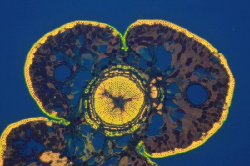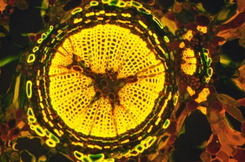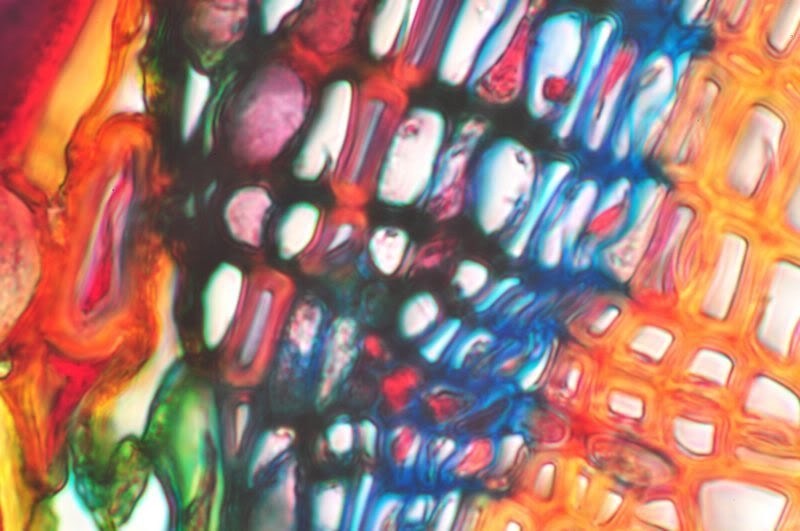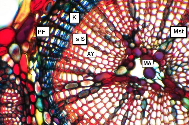 Im Phloem sind einige rotgefärbte sklerymatische Zellen zu erkennen, so wie das z. B. im Bast der meisten Bäume der Angiospermen (Bedecktsamer) üblich ist.
