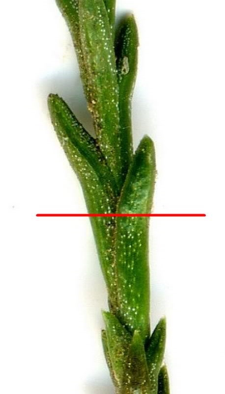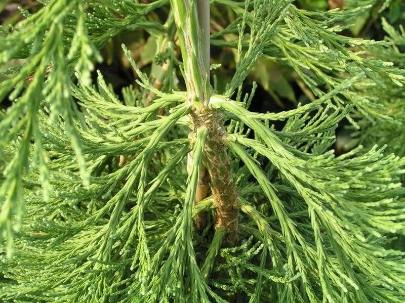 Die Blattorgane bedecken die Rinde junger Triebe und verleihen ihnen eine blaugrüne Farbe. Erst vom dritten Jahre an schlägt die rotbraune Farbe der Triebenden durch.
