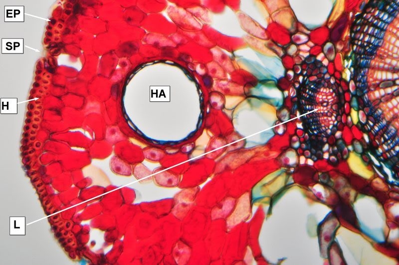 EP = Epidermis, SP = Spaltöffnung, HY = Hypodermis, HA = Harzkanal,