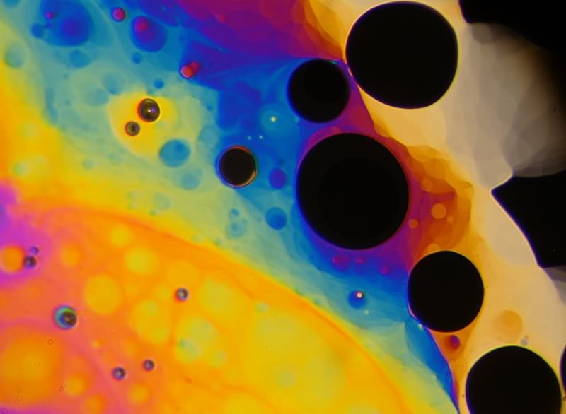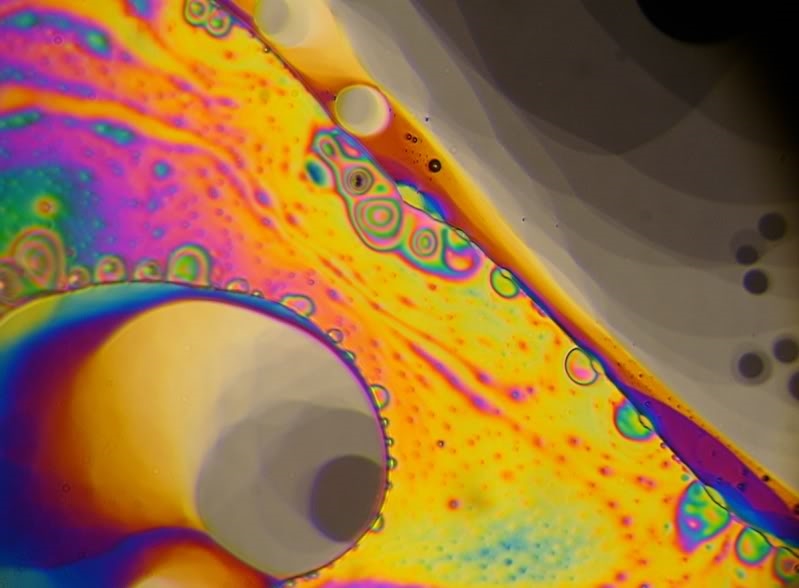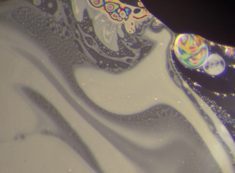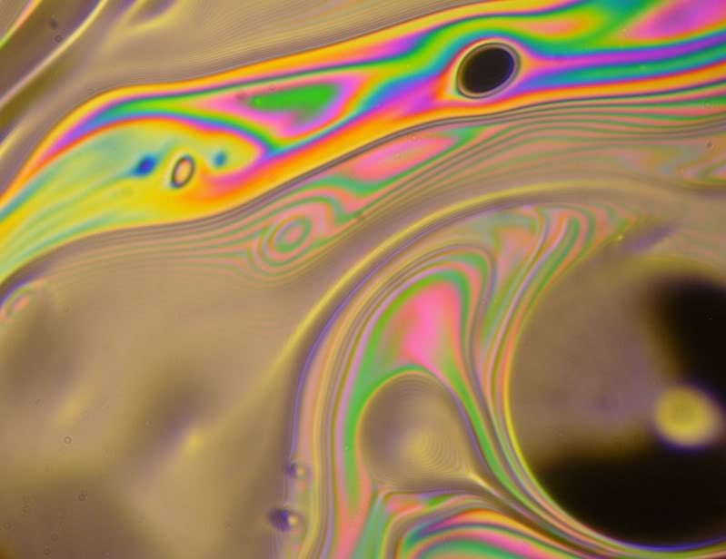 mit sehr suboptimalen Mitteln habe ich mal versucht die schönen Seifenblasenfarben am Mikroskop zu fotografieren. Da ich keine entsprechende Auflichteinheit fürs Durchlichtmikroskop habe mußte das Stemi herhalten. Das Plättchen mit dem Loch und dem darin befindlichen Seifenfilm leicht schräg druntergelegt und dann steil seitlich beleuchtet.