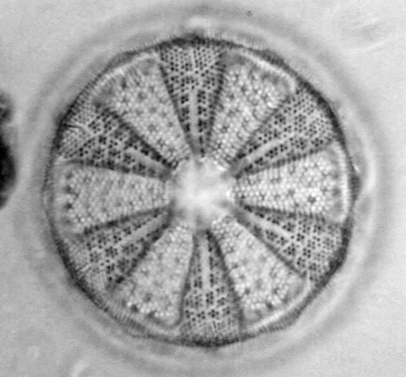 I was only capable myself of producing this level of image quality in COL with polarized light. Now, assuming the white lines are striae with pores (I'm never sure in COL), I was wondering why even the black lines appear dotted. If you check Herr Hoebel's marvellous FESEM image of A.pellucida, the interstriae are quite rigid bars. Simply interference, or does anybody have a more thorough explanation??