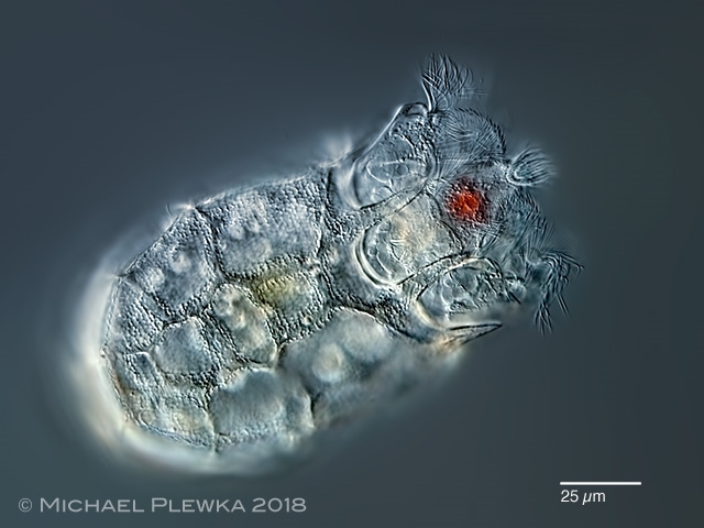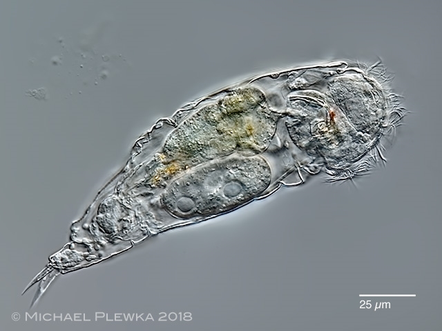 3. Microcodides chlaena, ein Rädertier, das bevorzugt  sauren, verkrauteten Tümpeln vorkommt: