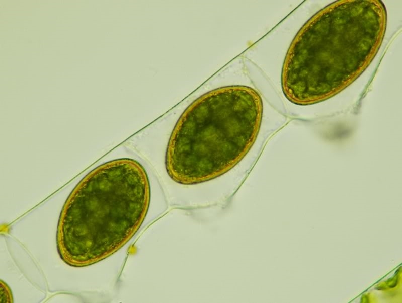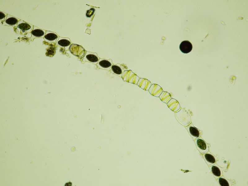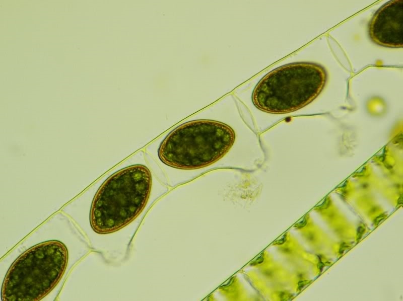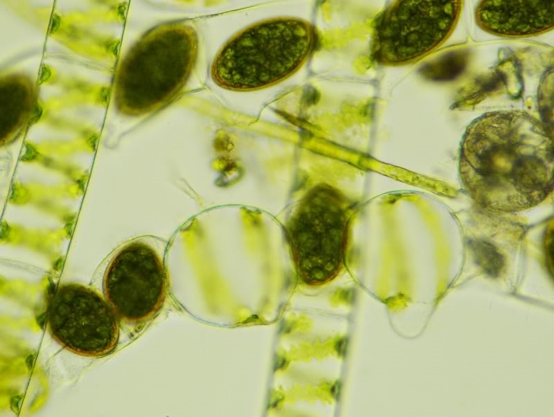 Hab einen Tropfen zuhause gleich mikroskopiert und fand meine "Ostereier", Zygoten einer Spirogyra-Zieralge (Objektiv 6,3x):