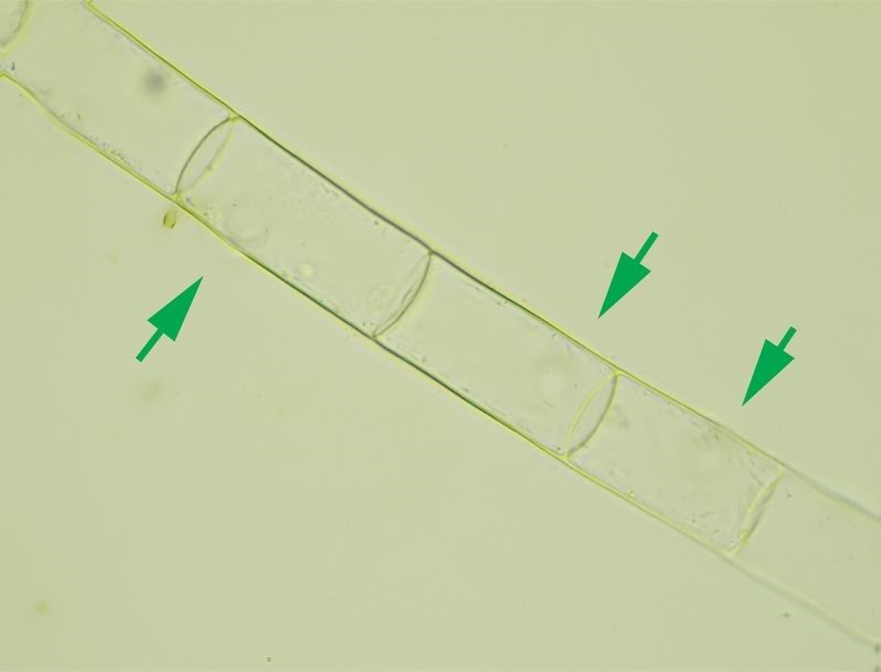 Im diesem Bild sind die leeren Zellen des männlichen Fadens zu sehen, die Pfeile deuten auf die Stelle wo ganz schwach die Kopulationskanäle zu erkennen sind.
