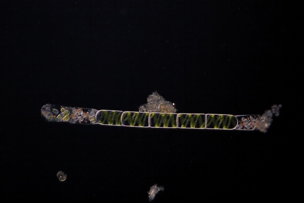 Ich persönlich mag das Phasenkontrastbild am meisten - die Schärfentiefe des Objektivs mit dem Phasenkontrast Effekt zeigt die Wendeln der Schraubenalge fast komplett scharf (16x Zeiss Plan Neofluar Phase Imm NA 0,5 mit Öl).