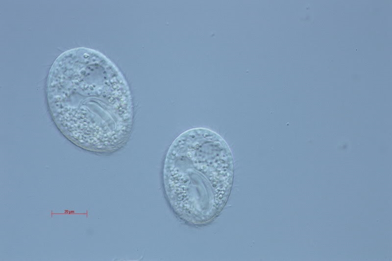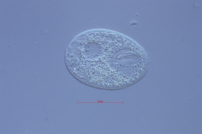 Auffallend war das mit Wimpern besetzte Peristom, das neben der Aktivität der Wimpern auch eine Eigenbewegung der "Lippen" zeigte. Es waren auch mindestens 2 kontraktile Vakuolen zu sehen.  Pellicula streifenförmig.