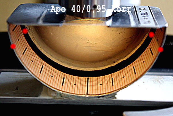 Prozedere: Methode 1: Apertometer-Skala genügend hell(!) beleuchten. Fokussieren des Mikroskops auf ein kleines Hilfsobjekt auf der Unterseite des Apertometer-Deckgläschens. Okular ersetzen durch einen engen Diopter, bequemer durch ein Hilfsmikroskop (dessen Aperturblende u.U. noch etwas verengen); dadurch die hintere Brennebene des Objektivs beobachten. Man sieht einen durch den Rand von dessen Aperturblende scharf begrenzten Ausschnitt der Skala. Diese zentrieren und X als halben Blendendurchmesser in mm ablesen. Berechnen: NA = sin(2,00 * X).