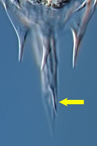 Erst bei genauer Fokussierung auf  sowohl die Ober- als auch die Unterseite kann man erkennen, dass eben doch ein Stachel vorhanden ist  (gelber Pfeil) .  Links: Unterseite, Rechts: Oberseite):