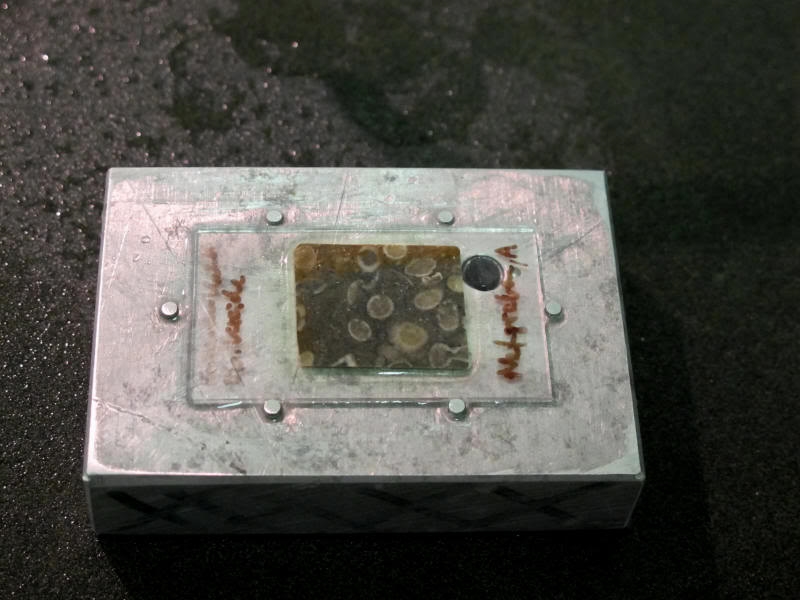 Grundsätzlich hat Jörg recht, dass für die Herrstellung von Dünnschliffen "schweres Gerät" (Formatiersäge, Trennsäge mit Diamant-Blatt, Tellerschleifplatten) ganz nützlich ist, aber es geht, wie Du mit den Glasplatten zeigst, ja auch einfacher. Auch die anfängliche Formatierung der Klötzchen, die nach dem ersten Schliff auf Objektträger geklebt werden kann man mit etwas Geschick und einem Winkelschleifer noch mithilfe von Baumarkt-Mitteln lösen.