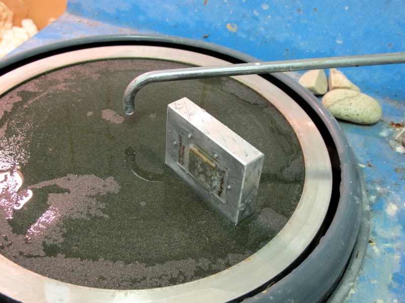 Ich schleife - faul wie ich bin - dann auf der Tellerschleifmaschine runter bis auf ca 100 µm der Rest wird auf der Glasplatte mit Siliziumcarbid bis zur Körnung 800 fertig geschliffen. Dafür habe ich mir mal vor 15 Jahren einen Halter machen lassen, der auch wieder die Fingerkuppen schont.