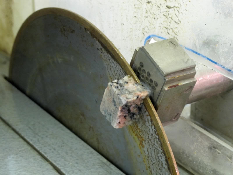 Dass ich sehr wohl sehr gefühlvoll den Vorschub auf der Diamantsäge dosiere siehst du als Fachman am Bild wo der letzte Zipfel der Granitprobe gerade noch hält. Dass da die ausreichende Wassermenge nicht zu sehen ist liegt daran, dass die Säge für die Aufnahme angehalten wurde.