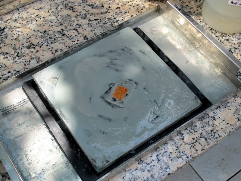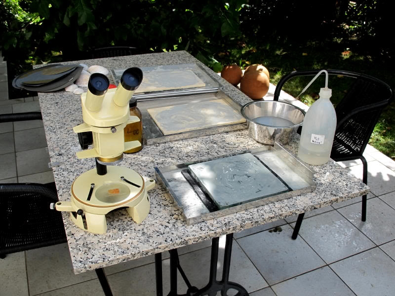 Der Arbeitsplatz im Garten zum Handschliff: Edelstahlmulden mit Schleifplatten auf einer Gummi-anti-Rutschunterlage. Die Schleifplatten klassisch aus dickem "Fensterglas" oder ganz edel: aus gesinterten Korund. Dazu hat der Präparator des mineralogischen Instituts an der Uni Stuttgart gesagt: so ebbes vornehms kennet mir ons net leischte! Die hatten Basalt-Schleifunterlagen, was auch nicht gerade alltäglich ist! ;)