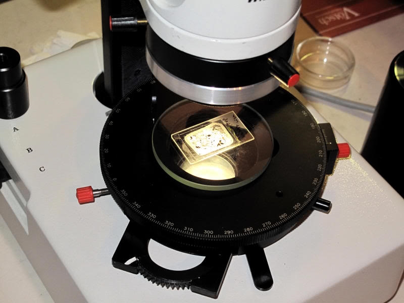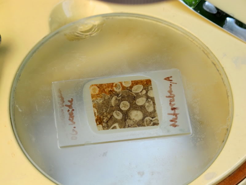 Es gibt auch größere Objektträger, 40X 60mm. Ich hab da welche von einem befreundeten Geologen geschenkt bekommen, zusammen mit einigen Gesteinsproben wie dem heute gezeigten Onkolitischen Kalk und einem schönen Nummulitenkalk. Den hab ich auf einen der großen OT´s geklebt und geschliffen. Ich wollte das dann auch noch zeigen.