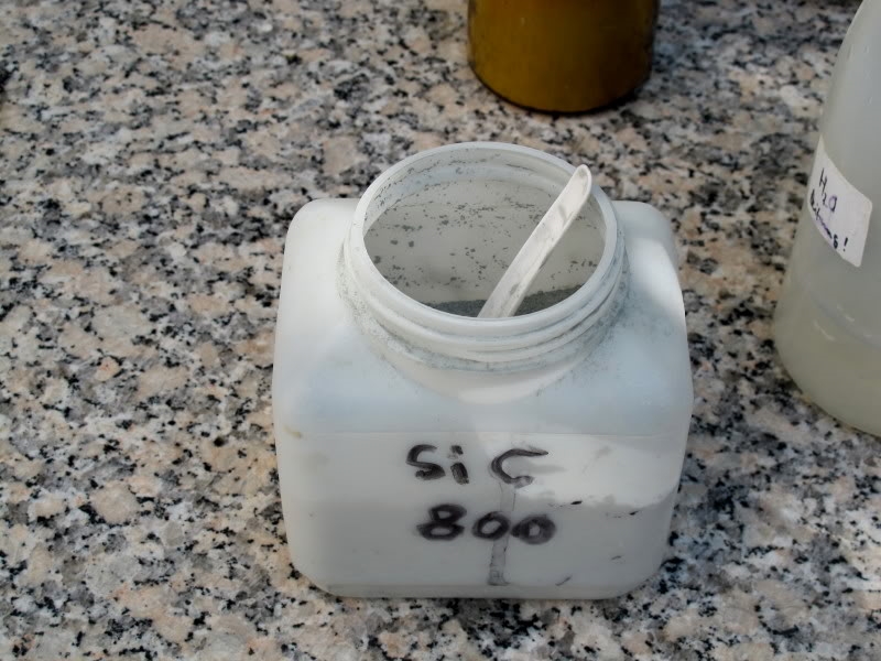 Jede Mulde für eine Körnung, damit man zügig wechseln kann. Ein "Waschbecken", eine Spritzflasche mit Leitungswasser, ein Stemi um den Fortschritt schell zu kontrollieren und Schleifmittel mit jeweils zugehörigem Löffel: Die Katastrophe ist die Kontaminierung von feinerem Schleifmittel mit gröberem. Da muss man sehr sauber arbeiten - oder alles abwaschen!