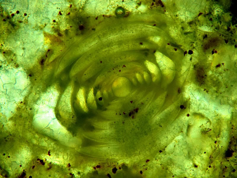 Einem Korallenkalk (Netgraben-Österreich?) auch ein Nummulith eher ein Einzelgänger, aber das Einzige, was bemerkenswert war. Für die Korallen war der Schliff schon zu dünn! Für die unwissenschaftlich bunte Kontrastierung möchte ich um Nachsicht bitten!