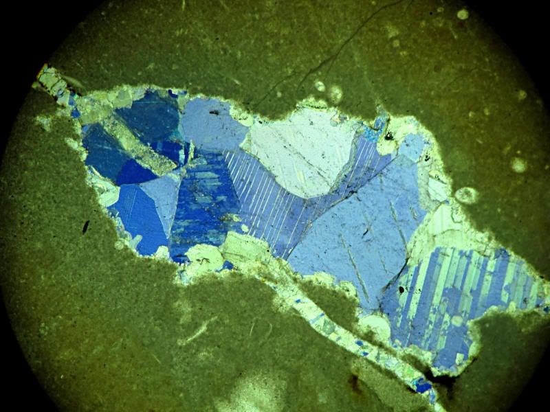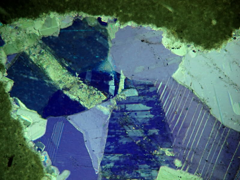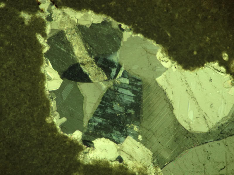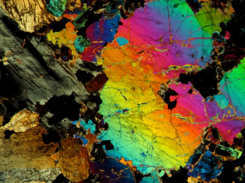 Thomas hat sehr richtig erwähnt, dass man zu Kontrolle während des Schleifens ein Pol-Mikroskop benutzen sollte. Ich muss mir mal ein abgewracktes Mikroskop dafür anschaffen. Ich erinnere mich gut an das schwarze Standard, das im Präparierraum an der Uni stand. Da sah man, dass das gar keine gute Umgebung für ein Mikroskop ist! ;D Der Schliff ist einer meiner ersten, den ich vor Jahren gemacht hatte: ein Granit. Gekreuzte Polarisatoren Stemi. Wie schön zu sehen: planparallel ist er nicht gerade  :(