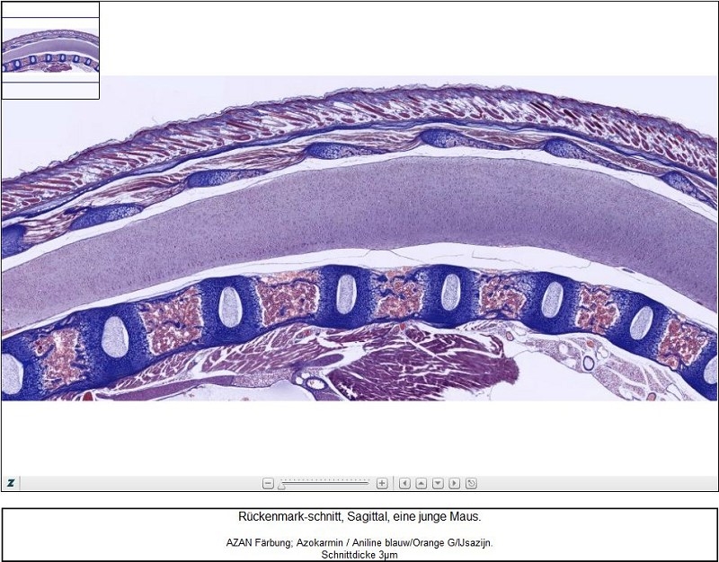 Ich bin leider histologisch völlig unwissend, könntest Du bitte den Schnitt beschriften und zeigen wo die Wirbelkörper, das Rückenmark und der Spinalnerv ist ?