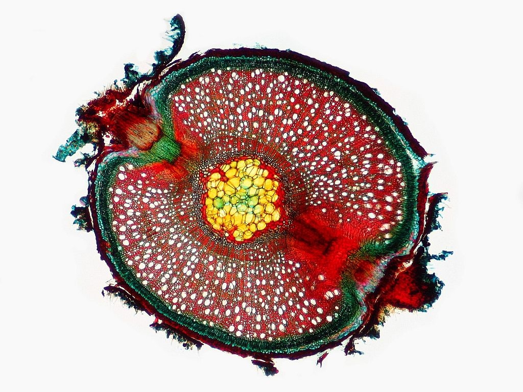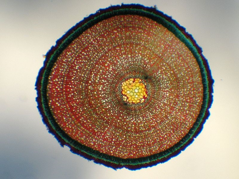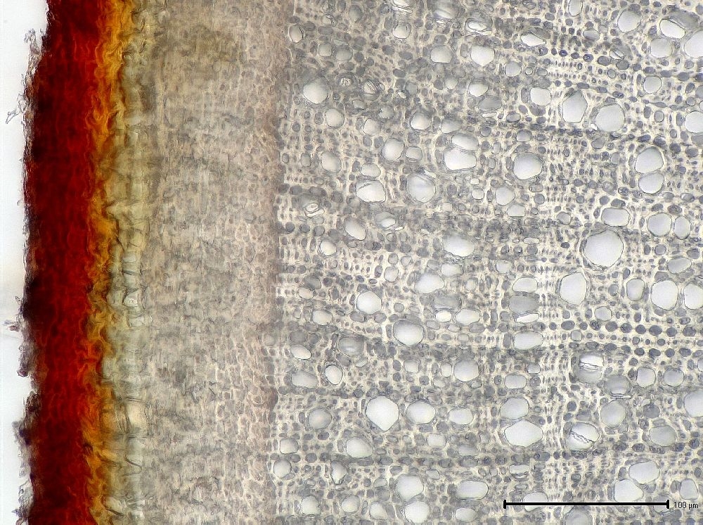 Auffällig erscheint mir der Ring rot gefärbter Zellen zwischen Protoxylem und Mark. Diese haben leicht sklerifizierte Zellwände und verfügen über große Tüpfel (?).