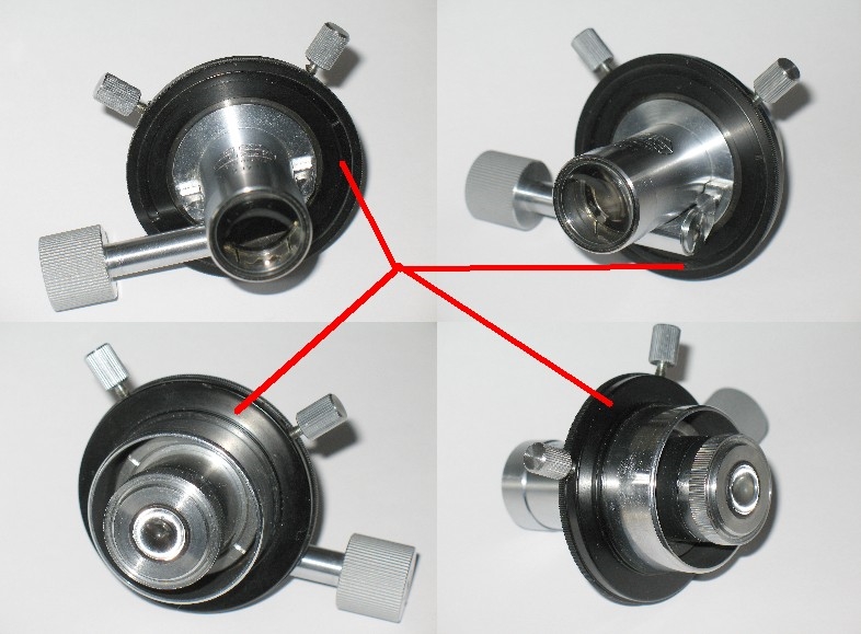 Für die Aufnahme an einem Standard Lab 14 hatte ich in die verchromte Hülse mit dem 39,5er Durchmesser eine schmale, spitzgrundige Nut eingedreht; das reichte zur Aufnahme zwischen den drei Spitzen. Das ganze blieb trotzdem an einem Mikroskop mit Steckhülsenaufnahme weiter verwendbar.