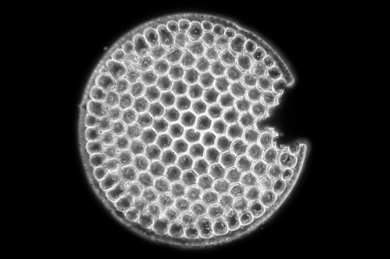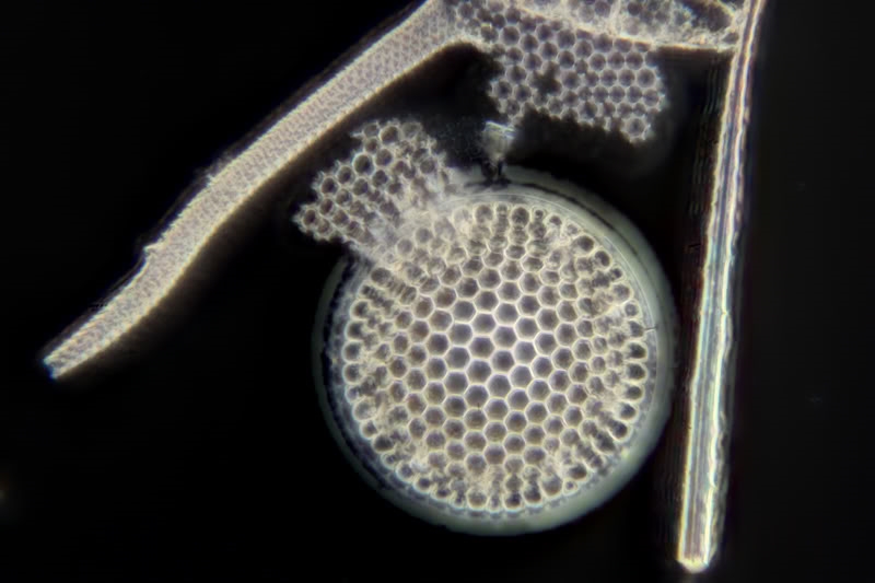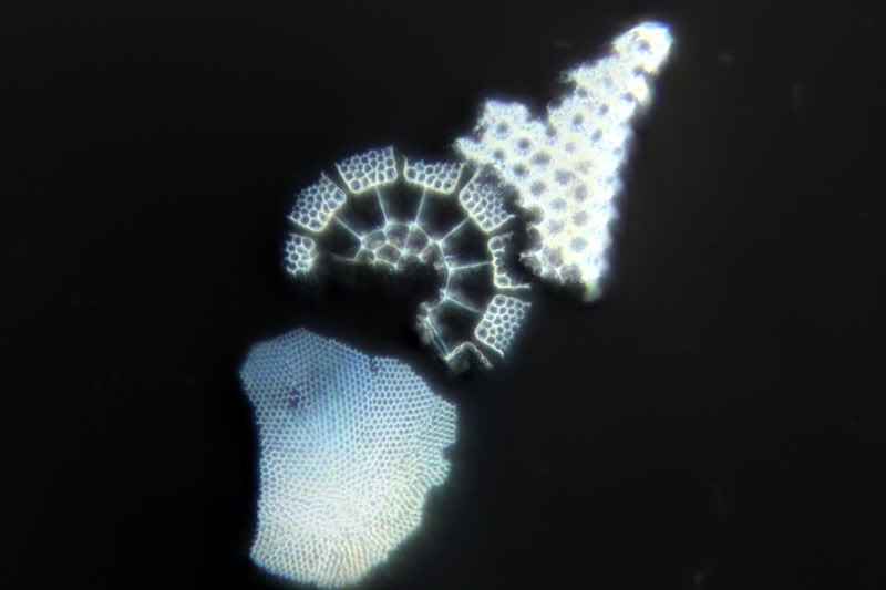 Bei den Abbildungen kommt es mir ausschließlich auf die ästhetische Wirkung an, deshalb habe ich auf sämtliche technischen Angaben sowie Bestimmungsversuche verzichtet. Nur soviel: Es handelt sich um fossile Diatomeen aus Oamaru, Neuseeland.