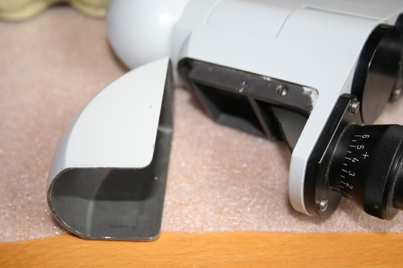 Nun meine Frage: wie kommt man denn an die Prismen dran? Die beiden Stutzen für die Okulare sind schnell abgeschraubt, auch die Ringschwalbe mit dem daran hängenden Prismenblock - der in Ordnung ist - auch. Aber wie macht man die seitliche Verkleidung auf? Ist das nur gesteckt? Da ist keine Schraube zu sehen!