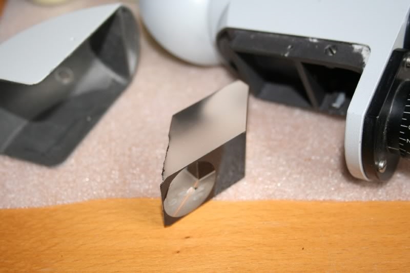 Soll das Prisma ausgebaut werden, ist die obere Klemmschraube zu lösen und von unten der Sicherungslack vorsichtig wegzukratzen. Nach der Reinigung will das Prisma aber auch wieder richtig eingesetzt werden, sonst gibt es krumme Bilder.