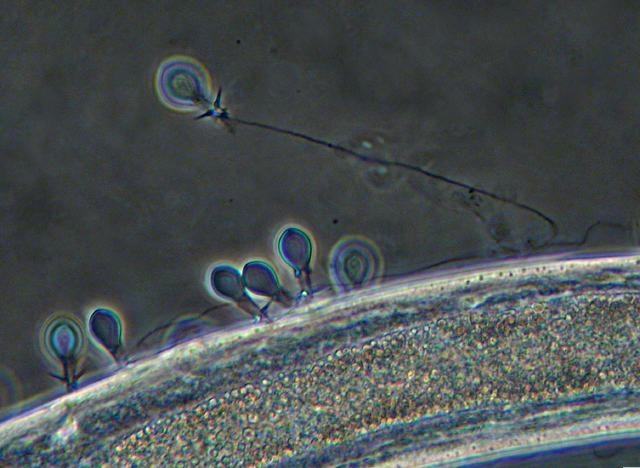 Ergänzend noch zwei Aufnahmen vom Kapseleinschlag. Hier ein Nematode, der einer Hydra zu nahe kam. Man sieht deutlich, dass er von einer Menge Nesselzellen getroffen wurde: